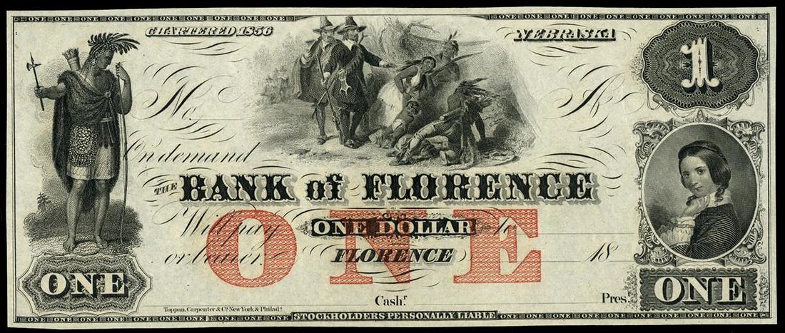 Nebraska. Florence. Bank of Florence. $1. 1850S. (NE-40 G2a) Red ONE. Settlers and Indians. PMG Gem Uncirculated 66 EPQ.
