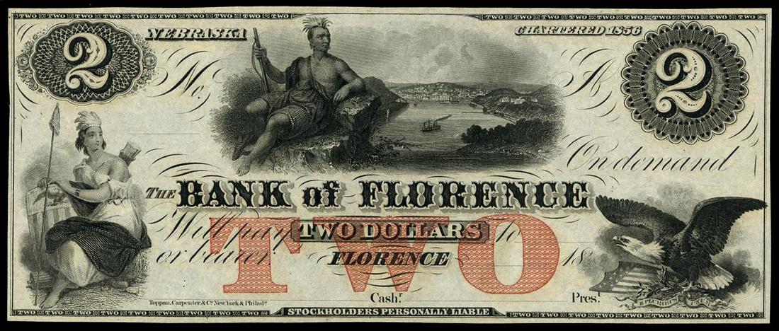 Nebraska. Florence. Bank of Florence. $2. 1850S. (NE-40 G4a) Red TWO. Indian sees "civilization" for the first time. PMG Gem Uncirculated 66 EPQ.