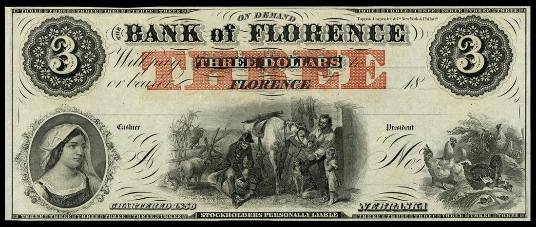 Nebraska. Florence. Bank of Florence. $3. 1850S. (NE-40 G6a) Red THREE. Men with horse, dog, child. PMG Gem Uncirculated 66 EPQ.
