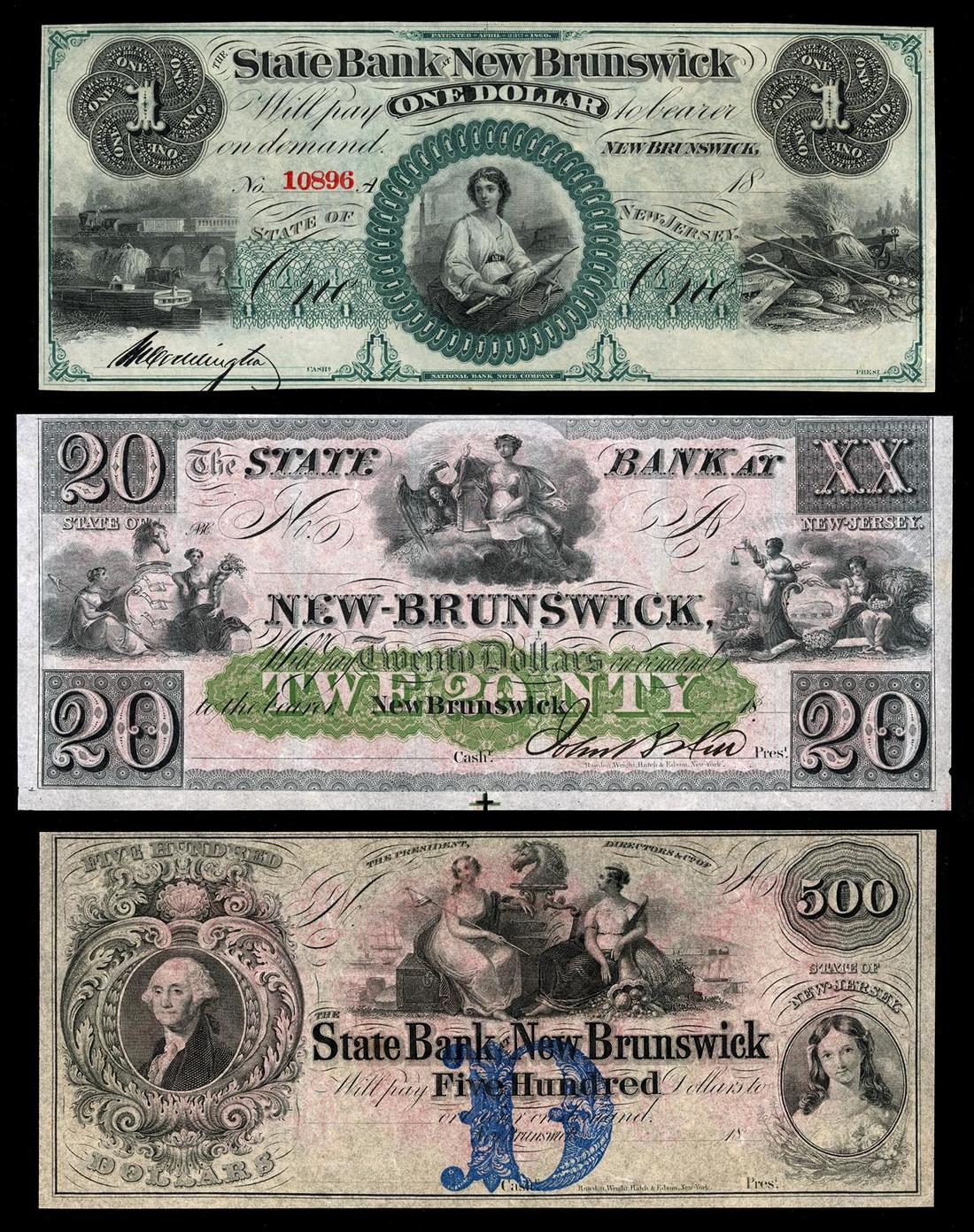 New Jersey. Colorful New Jersey Obsolete Paper Money Offering. Egg Harbor Bank $1 G2b Uncirculated. State Bank of New Brunswick $1 G16a; $2 G26c; G52c; $10 G62c; $20 G68c; $50 G76a; $100 G80a; $500 G84. All Uncirculated remainders. Also included area Farmers Bank of New Jersey 6 1/4, 1815, a Trenton $2 Merchants' Bank About Good, and a $7 Peoples' Bank of Paterson, Uncirculated remainder. [12]