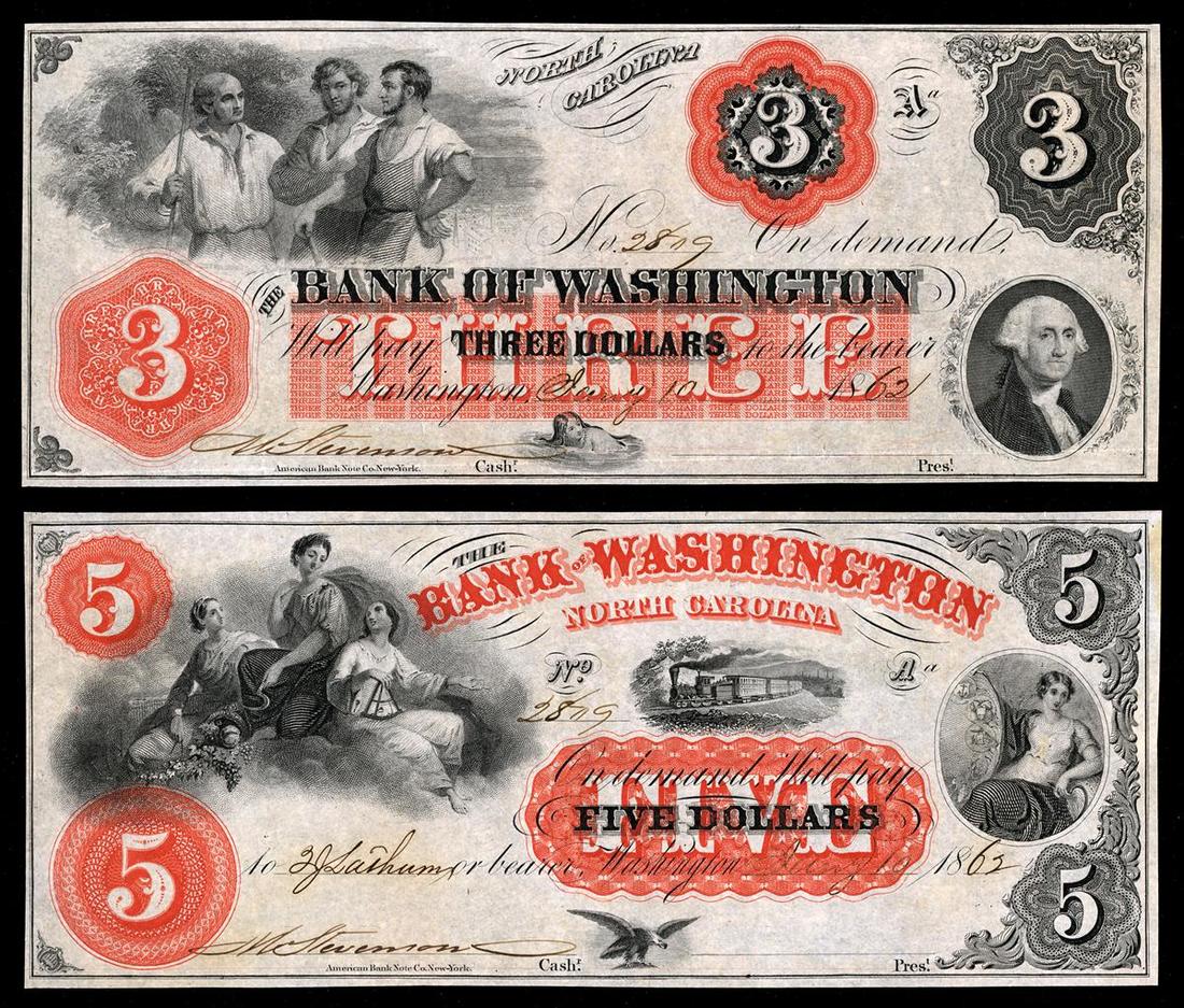 North Carolina. Washington. Bank of Washington. $3 G4a; $5 G12a, both Uncirculated remainders. [2]