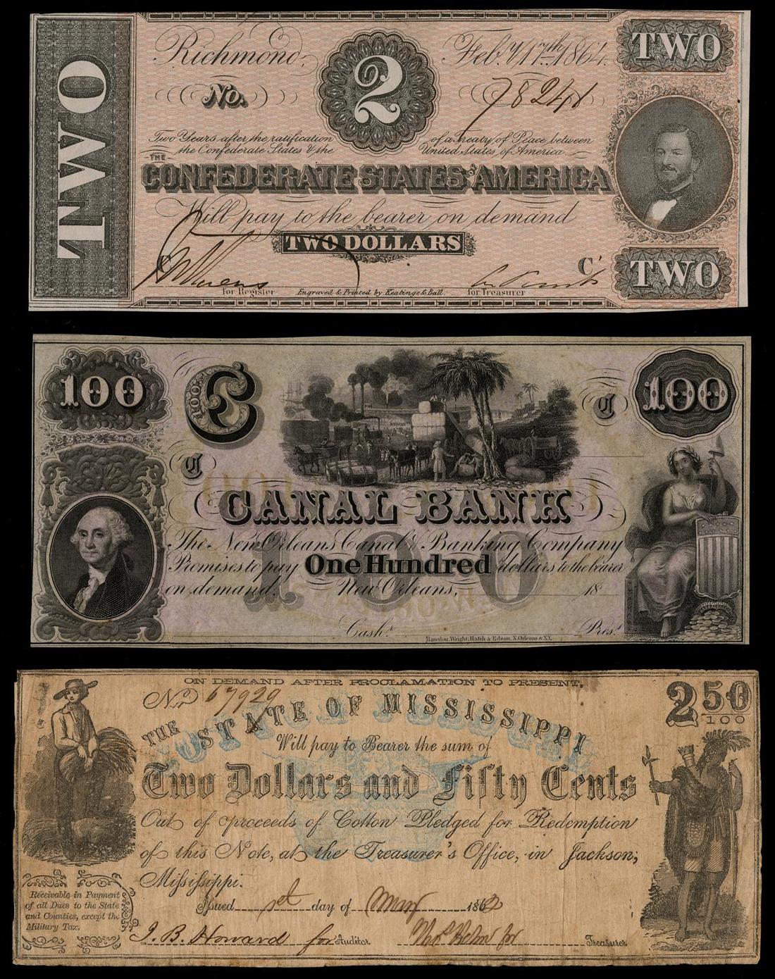Southern Obsoletes Septet: VA. County of Augusta, Staunton. 10 Cents, 1862; City of Petersburg. $1, 1861; GA. State of Georgia. Milledgeville. 50 Cents, 1864; TN. Mechanics Bank, Memphis. $3, 1854; MS. State of Mississippi. $2.50, 1862; LA. Canal Bank, New Orleans. $100, 18- (depot scene, Washington lower left); CSA. $2, 1864; also Fractional Currency. Fifth series. 10 cents. No Seal. About Fine-Unc. [8]