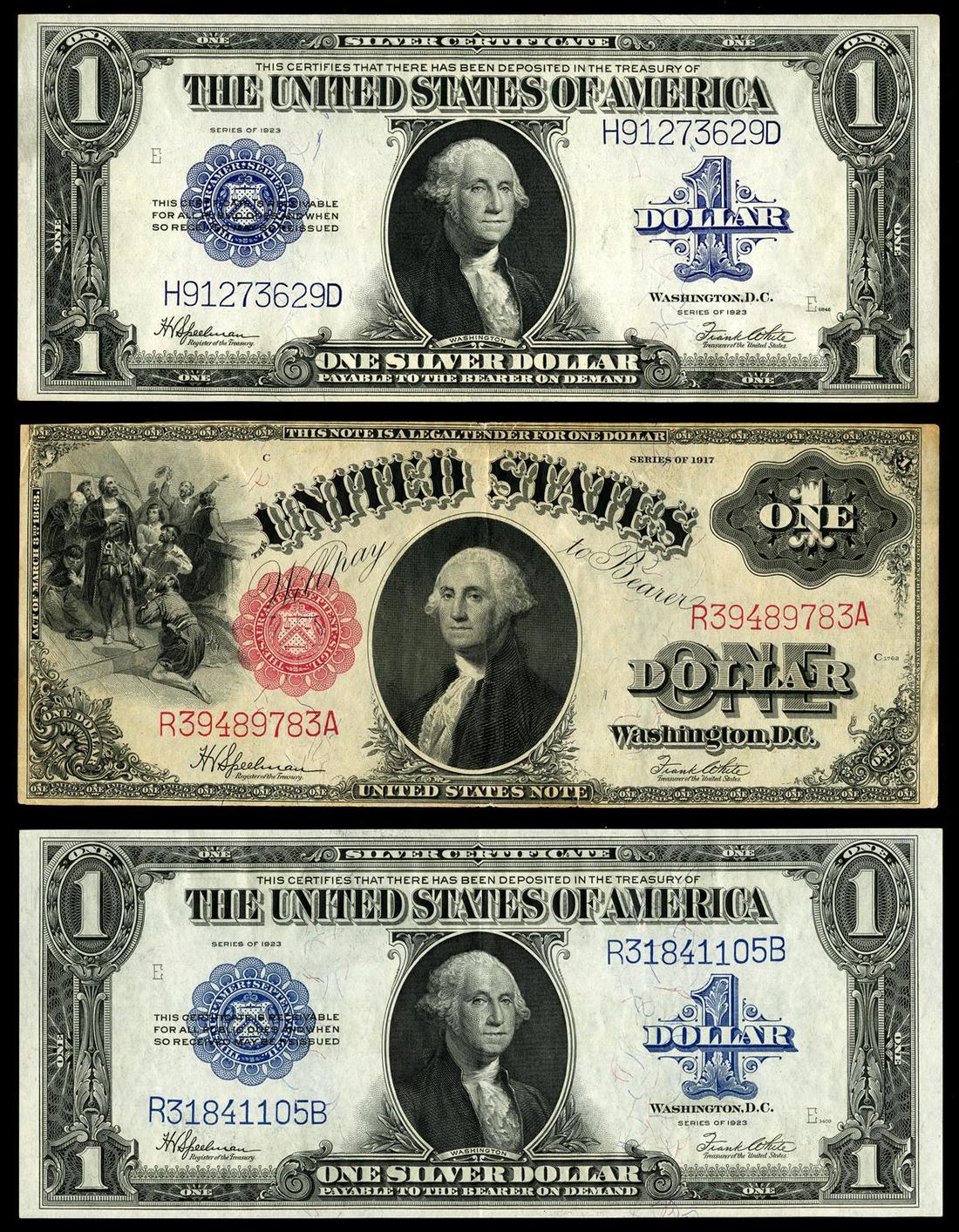 Large Size $1 Legal Tenders and Silver Certificates. Fr.39. 1917 VF-EF, some minor age toning; Similar F-VF, in a custom plastic holder; Fr.237 1923 EF in a custom plastic holder; Similar AU; Similar Uncirculated. [5]