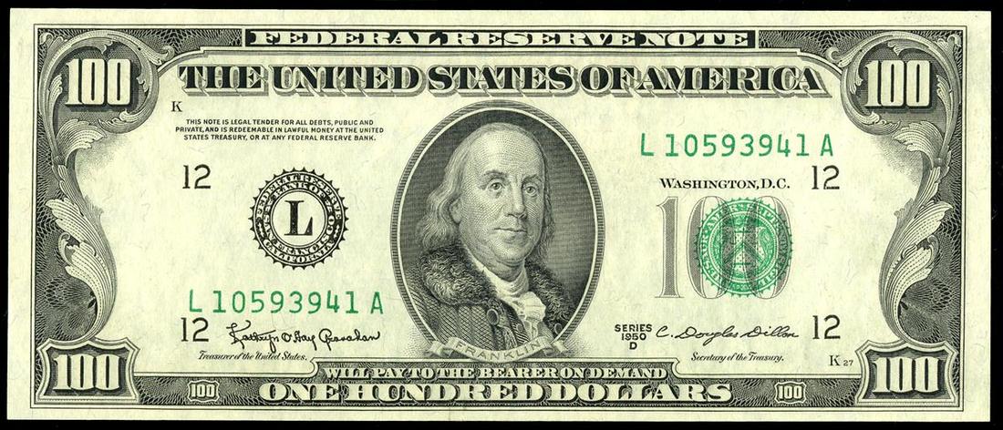 Fr.2161-L. $100. Federal Reserve Note. 1950D. No. L10593941A. PMG Gem Uncirculated 66 EPQ.