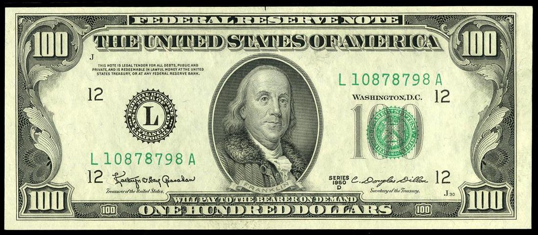 Fr.2161-L. $100. Federal Reserve Note. 1950D. No. L10878798 A. PMG Gem Uncirculated 66 EPQ.