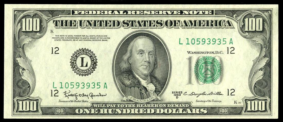 Fr.2161-L. $100. Federal Reserve Note. 1950D. No. L10593935A. K. PMG Gem Uncirculated 65 EPQ.