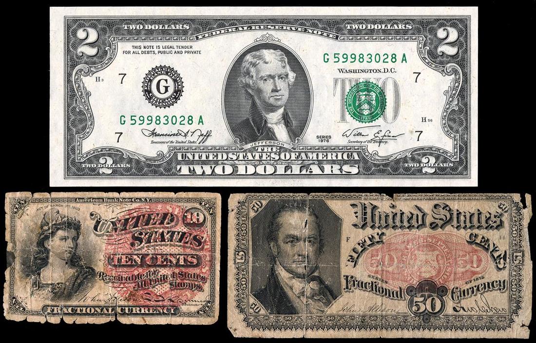 U. S. Small Size and Lower Grade Fractional Currency Grouping.  $2 1928D LT VG-F; $2 1953 AG; $2 1953A(2) both VF; $2 1963 VG-F; $2 1976 FRN(2) both Unc; $1 1928 S.C. Fine; $1 1935F VG; $1 1957 S.C. EF. Also included are a 2 Peso Philippine Victory note Fine-VF, and a Ten Sen Japanese Military Currency Unc. The two best pieces of Fractional Currency in the lot are a Fourth Issue 25 Cents About Fine, and a Fifth Issue 10 Cents, Fine. The rest of the fractionals are mostly Fourth and Fifth Issue, nine mostly intact, with tears, body holes and small pieces out, and the other twenty-five or so examples are merely partial notes and fragments.
