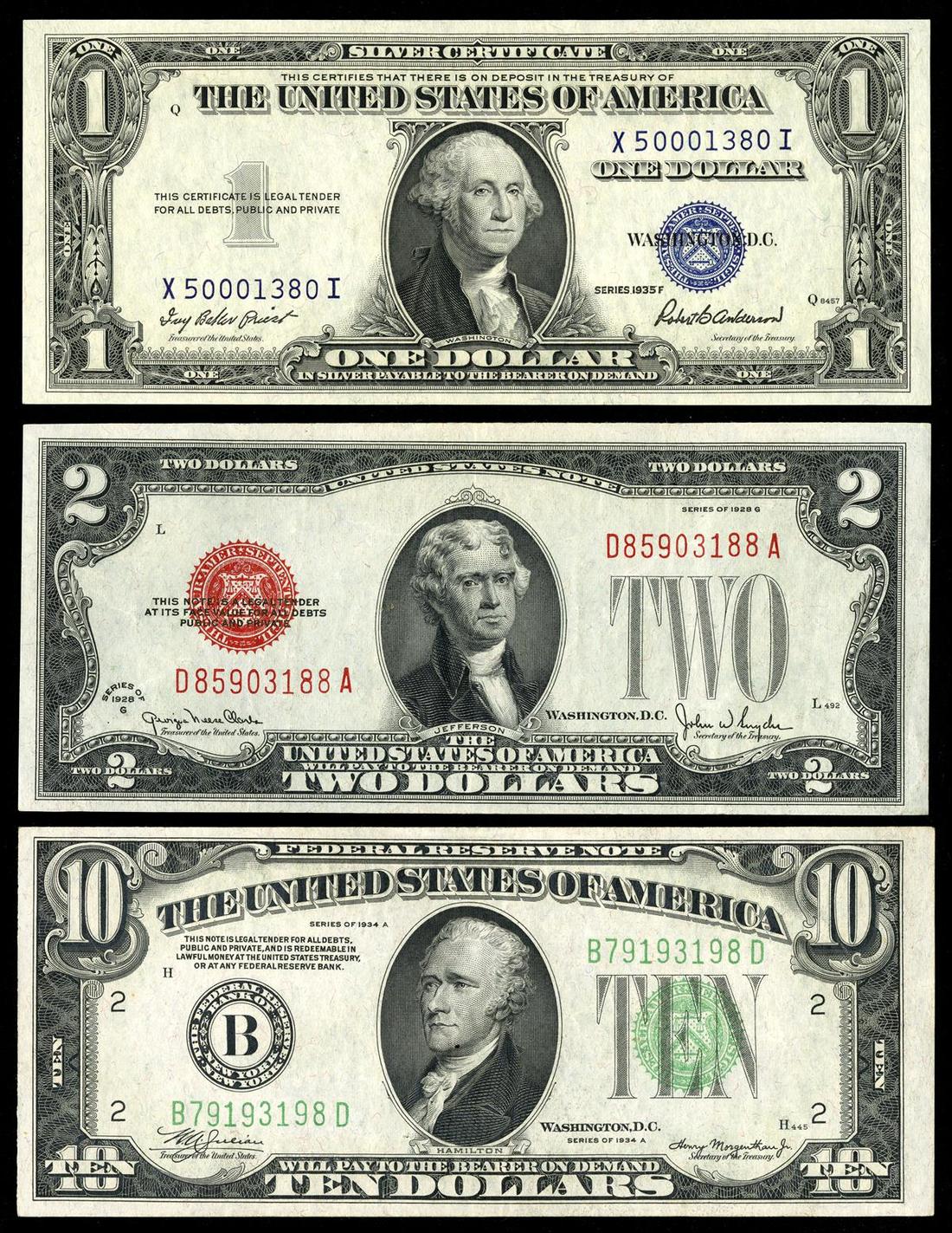 U. S. Small Size Currency Assortment. $2 LT 1928G VF; $5 LT 1928A AU; $1 SC 1935F Unc.; $5 1934 SC AU; $5 1934A North Africa SC VF-EF; $10 1934A North Africa(2) EF-AU, AU; $10 1928A FRN B-D block AU. [8]