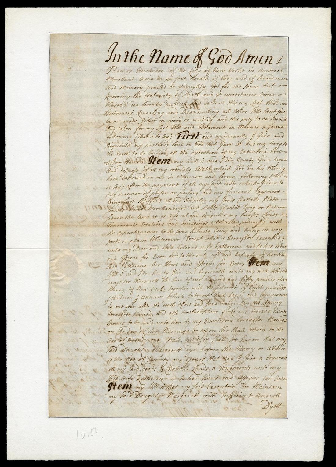 Colonial America. Edward Hyde, Lord Cornbury. Governor of New York and New Jersey, cousin to Queen Anne. Characterized by historians as an arrogant "fop and wastrel", moral profligate and cross-dresser, Lord Cornbury, who preferred to be called "high Mightiness", was perhaps the worst governor appointed to the American colonies and certainly - thanks to his penchant for appearing in public in women's clothing and his extravagance -- the most scandalous and curious. Document Signed as Governor of New York -- "Cornbury". Two pages, 8 x 13" and tipped onto a slightly larger sheet, New York, October 17, 1703. Last Will and Testament of "Thomas Howardson of the City of New York in America, merchant" noting that one of the witnesses, William Sharpas has sworn that Howardson was of "sound and perfect understanding" when making his will. Cornbury signs boldly at bottom, small wafer seal by Howardson signature. A Very fine and Choice document.