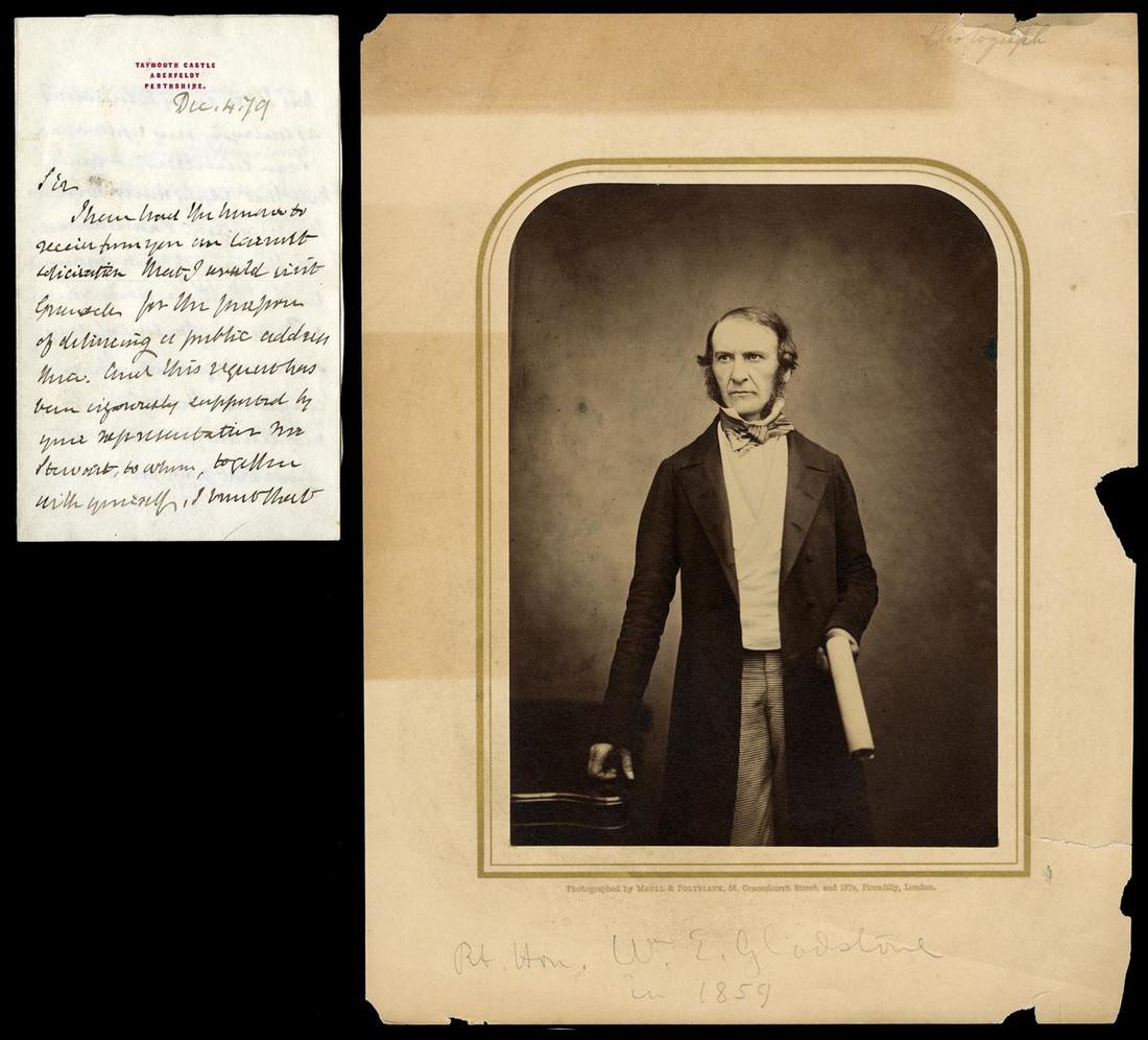 Gladstone, William Ewart. December 29, 1809-May 19, 1898). FRS, FSS. British Liberal politician who served as Prime Minister an unprecedented four separate times (1868-74, 1880-85, February-July 1886 and 1892-94), and was Chancellor of the Exchequer four times. At the age of 84, Gladstone was also Britain's oldest Prime Minister. ALS. 8vo. 3 pages. December 4, 1879. Taymouth Castle, Aberfeldy, Perthshire. To James Murchison?, turning down a request to deliver a public address, and conveying his wishes for success in the upcoming elections. Also included is a photograph of Gladstone taken in 1859 by Maull & Polyblank, in very good condition, but with torn margins, an 1882 extract from Vanity Fair entitled "Mr. Gladstone at Hawarden," and an 1869 Vanity Fair caricature of Gladstone.