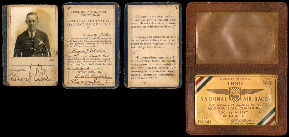 Wright, Orville.  (August 19, 1871 - January 30, 1948). National Aeronautic Association of U. S. A., Inc. Aviator's Certificate dated. July 26, 1930. 6pp. 3" x 4 4 1/4." The Aviator's Certificate is issued to Wayne J. Sheldon, test pilot for (Sealed Power) Piston Ring Co. of Muskegon, Michigan. The Aviator's Certificate, separated into three parts, has a green cover with gold lettering. The inside front cover states that Wayne J. Shelton " …having fulfilled all the conditions required by the Federation Aeronautique Internationale for an Aviator Pilot is brevetted as such." Orville Wright signs his full name, in brown ink, near the bottom of the inside front cover. The second panel includes a photograph of Wane J. Sheldon, his signature, and an embossed seal of the Association. The following panel, and the inside front cover bear the words "The Civil, Naval and Military Authorities, including the Police, are respectfully requested to aid and assist the holder of the Certificate. " This message is repeated in five other languages. Also included is an exclusive admission card to the 1930 National Air Races. After selling his company in 1915, Orville Wright spent the last thirty years of his life serving on boards and committees related to aeronautics, including the National Advisory Committee for Aeronautics, predecessor to the National Aeronautics and Space Administration.