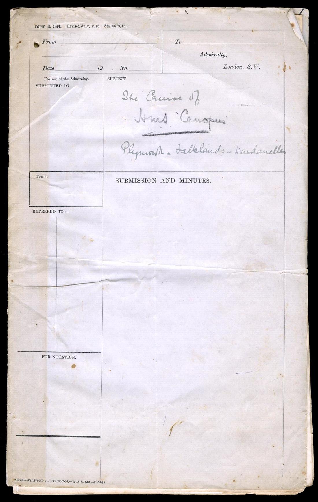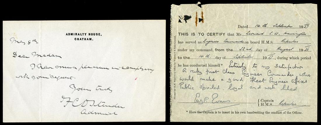 Naval Log of the HMS Canopus. 1914-1915. 16-page typescript detailing World War I naval action in Plymouth, Falklands, Dardenelles and elsewhere. "The cliffs here rose steeply from a narrow beach and no praise can do justice to the valor and determination with which they have been stormed and carried." Included is a form from Eugene R. Evans, Captain of the Repuki, certifying that Leonard C. W. Harrington served satisfactorily as First Class Engineer. Also included is a note, on Admiralty House, Chatham stationery, from Admiral Kinder. Must be seen, sold as is, no return.