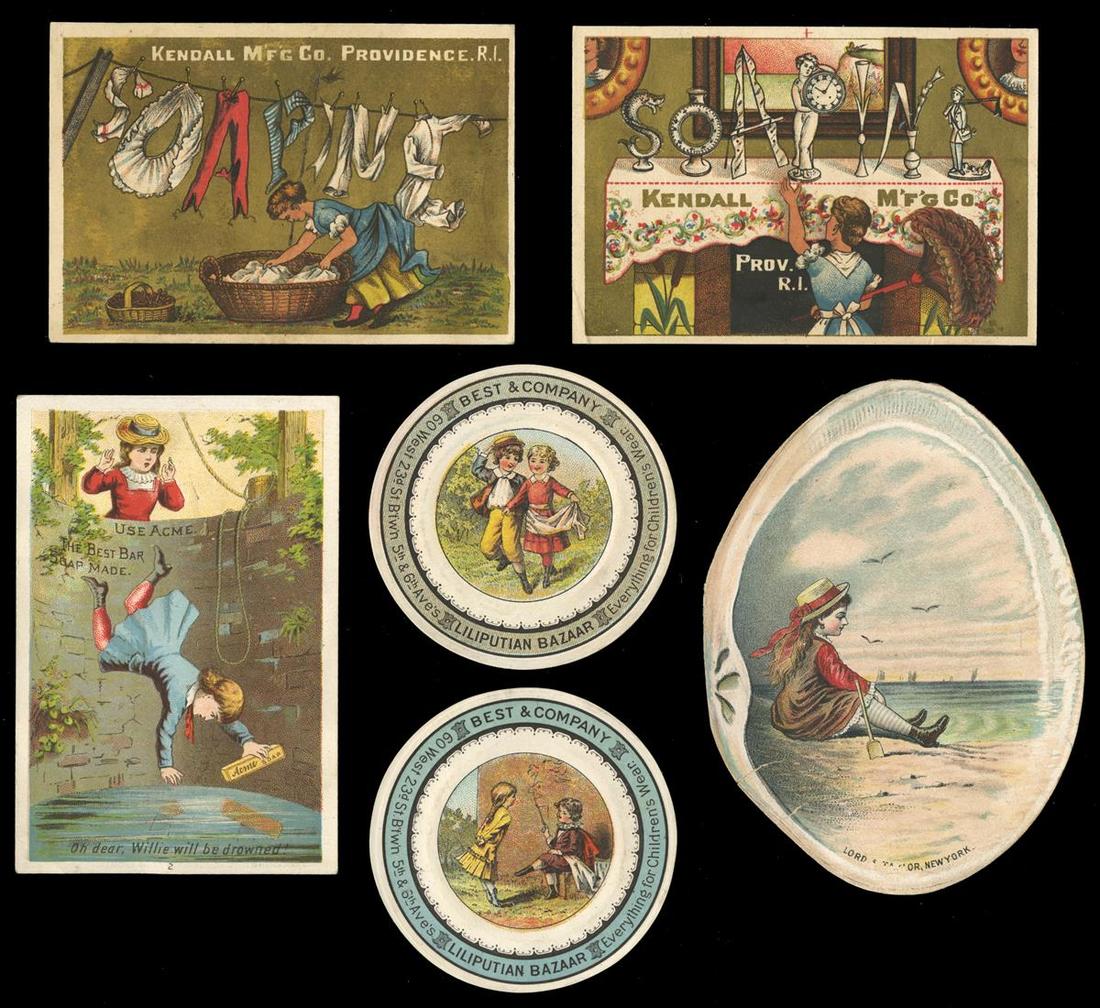 A Large and Colorful Album of Cigarette Cards and Trade Cards A dozen Beteen the Acts Thomas H. Hall cigarette cards. Two Fatima Turkish cigarette cards. One hundred and eighteen assorted trade cards including Clark's, Soapine, Bluxome, Bedell, Liliputian Bazaar, J. & P. Coats, Lautz Brothers, Lustro, Hagar & Clapp and more. Fair to Fine.