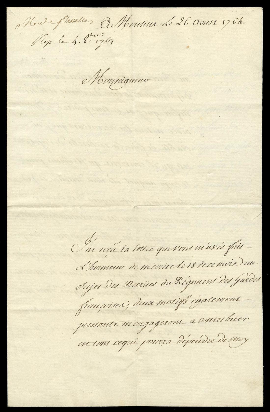 de Flesselles, Jacques (1730-1789). Intendant of Moulins (1762), Rennes (1765) and Lyon (1768-1784); sponsored a Mongolfier ballon in 1784 named Flesselles in his honor; on 21st of April, 1789, became the last provost of the merchants of Paris, in July, he received demands to provide weapons to equip a citizen militia, but was only able to muster up 3 muskets and his suggestions as to where there might be more weapons proved mistaken or misleading. Following the storming of the Bastille, de Flesselles became one of the earliest victims of French Revolution; accused of royalist sympathies, he was surrounded by a mob, shot then decapitated. Autograph Letter Signed "de flesselles" as Lieutenant-General of Moulins. Four pages, 7 7/8 x 12 1/3", Moulins, August 26, 1764. Writing to the Duc de Biron, Marshal of France and commander of the French Guards, de Flesselles expands on his desire to please Biron in his request for recruits and that he has given orders to his agents and sub-delegates to earnestly recruit for the Guards regiment. Fine.