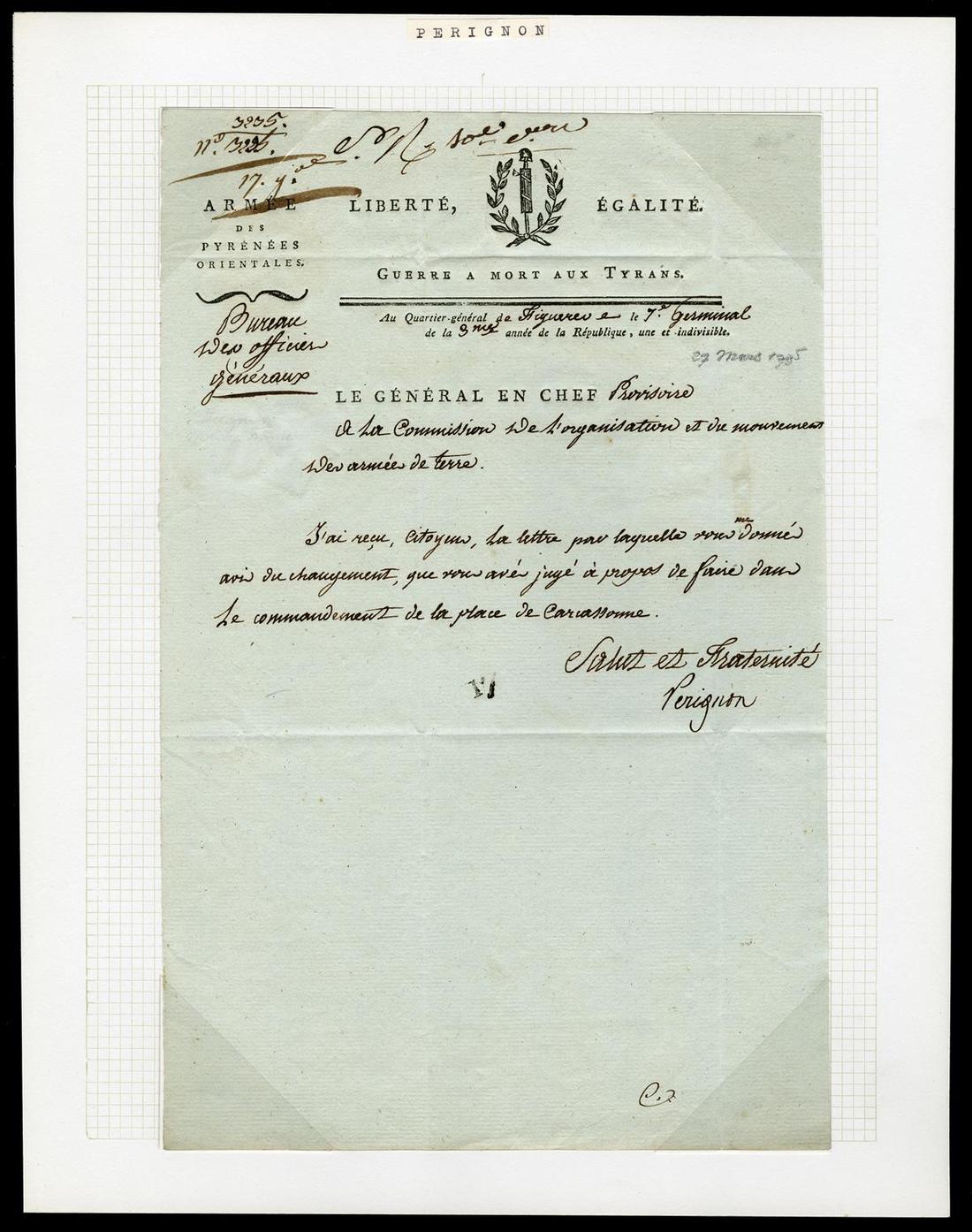 Pérignon, Catherine-Dominique (1754-1818). Held commands in the Army of the Eastern Pyrenees (1793-1795), succeeded General Dugommier as commander, served on the Council of Five Hundred, and as Ambassador to Spain under the Directory; made senator, Marshal and Count by Napoleon, awarded Legion of Honor in 1805, Governor-General of the Duchy of Parma. Autograph Document Signed "Perignon" as commander of the Army of the Eastern Pyrenees. Folio. One page on Armée des Pyrénées Orientales letterhead, 7th Germinal, An 3. Fasces in wreath, "GUERRE A MORT AUX TYRANS" below. Pérignon writes to a Citizen that he has received his letter regarding a command at Carcassonne. He signs below "Saluts et Fraternité". Accompanied by 19th Century engraving of Pérignon (tapemarks). [2]