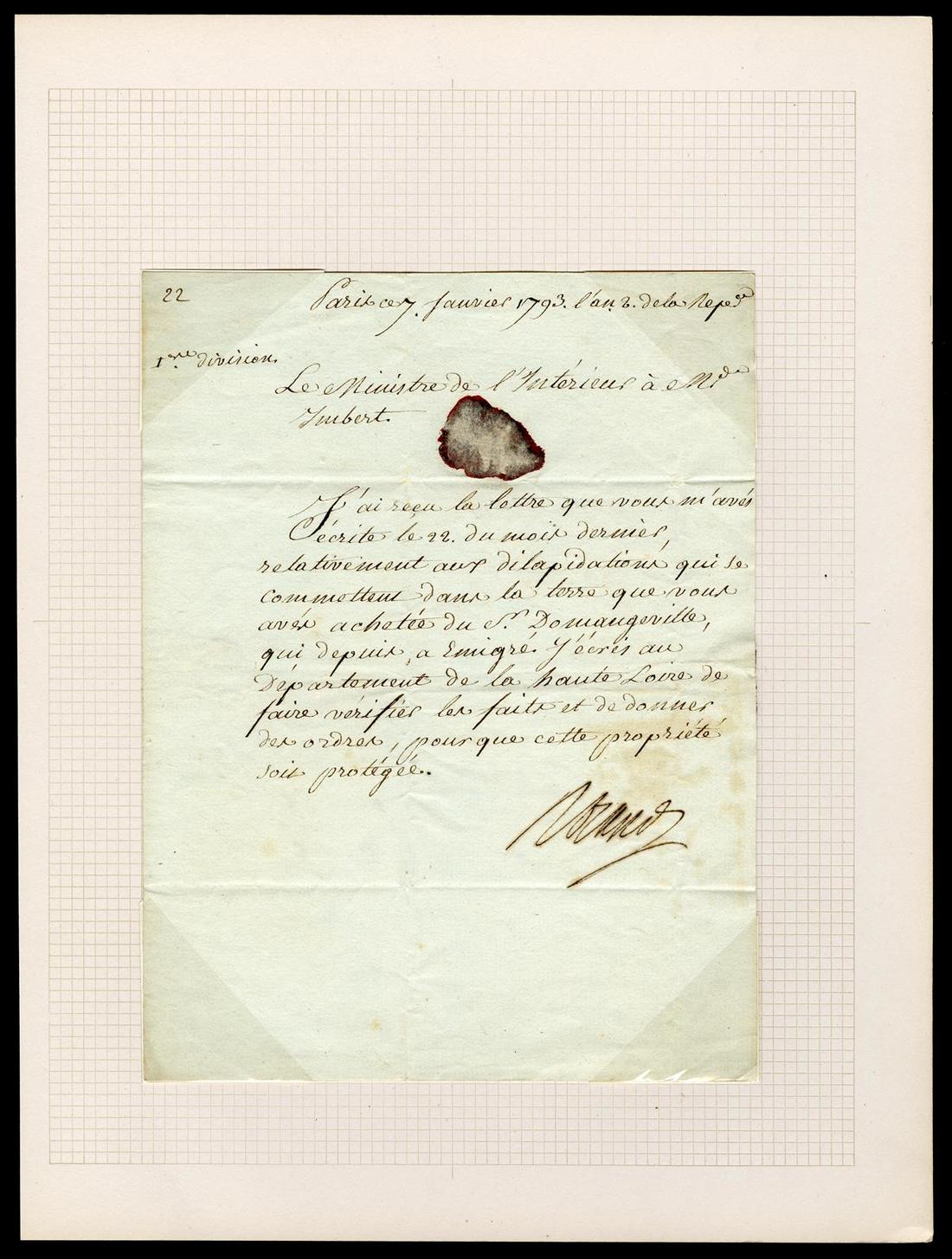Roland, Jean-Marie (1734-1793). Vicomte de la Platière, leader of the Girondist faction in the Revolution, served as Minister of the Interior in the 1792 government of Louis XVI. Opposed the Montagnards and hostile to the Paris Commune; Roland's attacks on Robespierre made him unpopular. During the trial of the king, Roland and the Girondists demanded that Louis' fate should be decided by a poll of the French people not the National Assembly. Roland resigned two days after the king's execution. Soon after, the Girondists came under attack and Roland was denounced. He fled Paris and went into hiding, his was wife was taken and executed. When he learned of her death, he wandered out of his refuge in Rouen, wrote "From the moment I learned that they had murdered my wife, I would no longer remain in a world stained with enemies" on a paper which he attached to his chest, sat up against a tree and ran himself through with a cane-sword. Letter Signed "Roland" as Minister of the Interior. One page, 7 x 9 ¼", Paris, 7 January 1793. Writing to Madame Hubert, two weeks before the execution of the king, Roland notes that he has received her letter regarding the state of affairs of a certain property and has written to the Département de la Haute Loire in that regard. Red wax seal effaced at top. Fine.