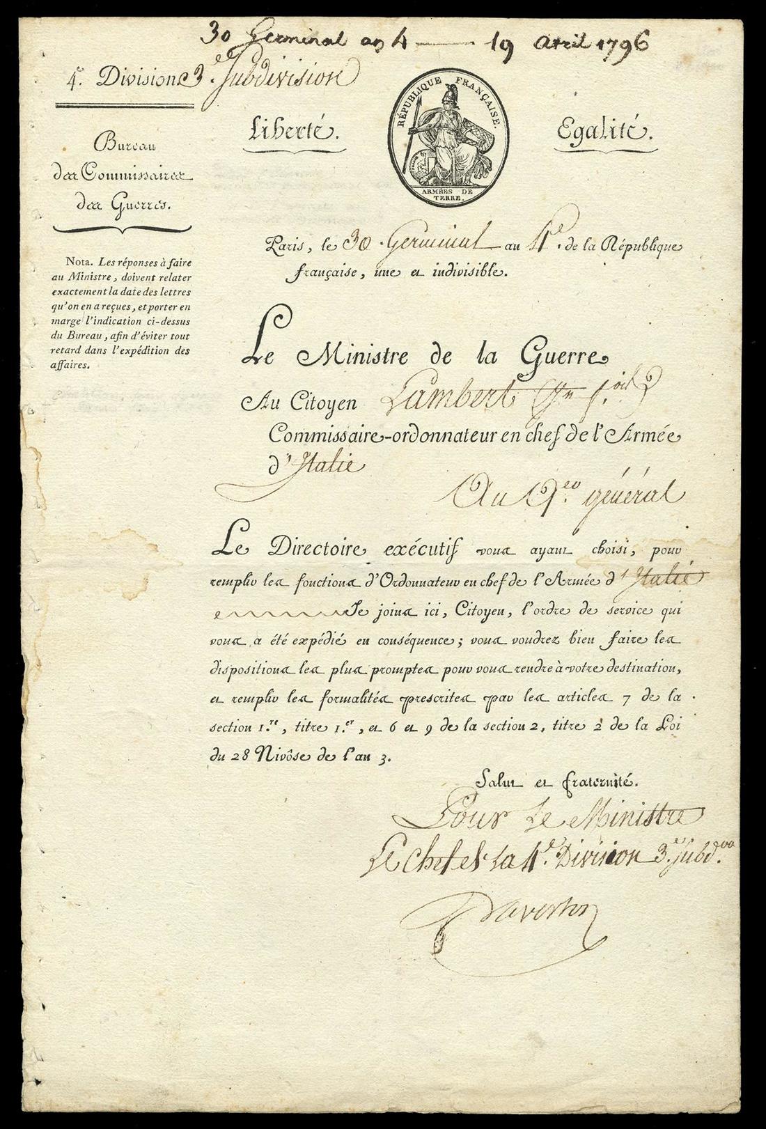 France. Pre-Revolutionary and Revolutionary Era. Lot of Letters and Documents: 1) Order with letterhead of "Germain Dubois de Crancé, Chevalier, Conseiller du Roy", signed by him below; 2) Certificate regarding a Gendarme of the 35th Division signed by Santerre and Menou, Brumaire An 2; 3) Interesting letter from Joseph-Marie Servan, French general and Minister of War during the Revolutionary period, 20 March 1793 regarding the 5th Battalion of Haute Gironne and the defense of the Pyrenees; 4) 'Comité de Salut Public' Document, Fructidor An 2, signed by Laloy, Cochon de l'Apparent, Delmas, Jean-Baptiste Treilhard, Merlin de Douai and others; 5) Convention Nationale Document, 9 Germinal An 3, signed by Saint-Prix; 6) Petition of Citizen Benavin to the Minister of Public health, 8 Frumaire, An 2; 7) Order from "Le Comité de Salut Public", 26 Germinal An 3, signed by Fourcroy, Auby, Marec, and Merlin de Douai; 8) "La Commission de l' Organisation et du Mouvement des Armées de terre" letter signed by Bénézech (in charge of Artillery), 6 Fructidor An 3; 9) Letter from the Ministry of External Relations, 12 floreal (year 4 or 5) signed by Charles Delacroix; 10) Ministry of War notice, 19 April 1796, regarding Citizen Lambert Commissaire Ordonnateur in the Army of Italy signed by Daverton; 11) "Armée d'Italie Order, Milan An 6, from Lambert, Commissaire Ordonnateur; 12) Letter from Moulin, Général commandant en chef la 17e Division militaire, 17 Ventose An 6; 13) Letter, dated 28 Floreal An 6 (May 17, 1798) from Marie Jean François Philibert Lecarlier, Minister of Police (on his first day of office); 14) Letter signed by General Gabriel-Marie-Theodore-Joseph, Comte d'Hédouville, 23 Brumaire An 5; 15) Circular, 26 Brumaire An 7, concerning postal delivery. Very Good-Fine [15]