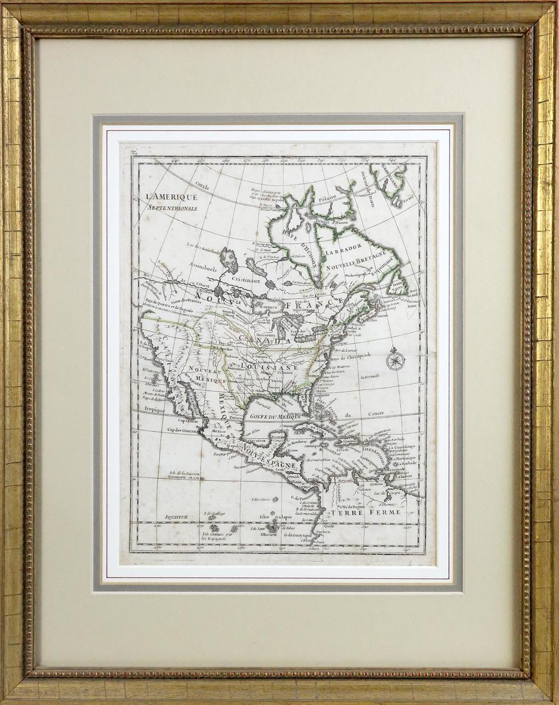 L'Amerique Septentrionale. Published by Georges Louis Le Rouge, Paris 1748. 8 ½ x 11 ½", outline color. Scarce map of North America with an early example of the River of the West connecting Lake Superior to the Pacific, and a pleasing treatment of the interior utilizing many native American place names. Attractively matted and framed, 15 x 19". Very Good.
