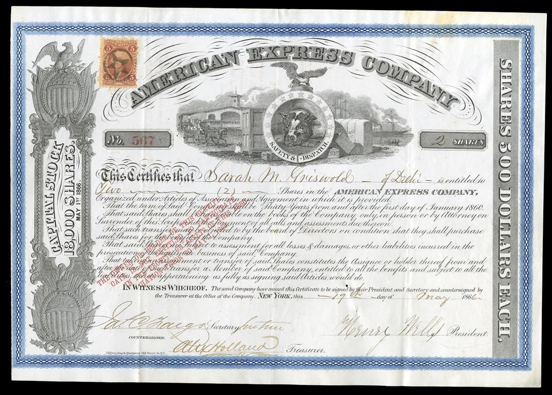 American Express Company (New York) 1866. 2 shares. No.567. Blue borders. Dog and key in circular frame. Signed by Henry Wells and James Fargo. CAPITAL STOCK 18,000 SHARES, left. Also included is Merchants Union Express Company, 1869, 10 shares, VF. VF+. Two pinholes. [2]
