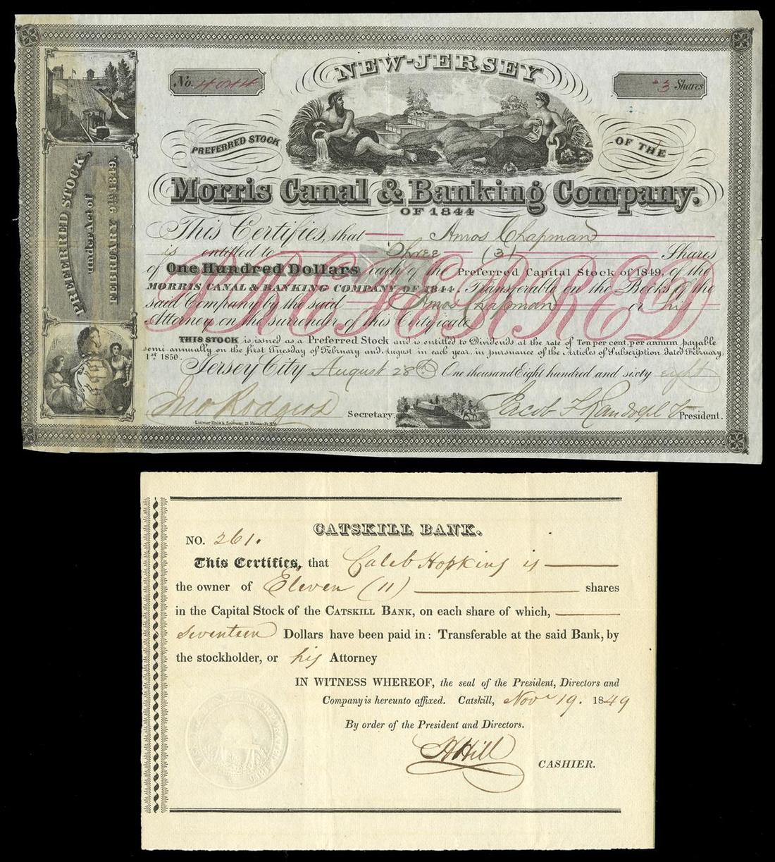 Banking and Insurance Share Certificate Assortment Iron mill. State arms above the counters. Allegorical women representing Commerce at the sides. A scarce, bank note quality certificate engraved by Underwood, Bald, Spencer and Hufty. [7]