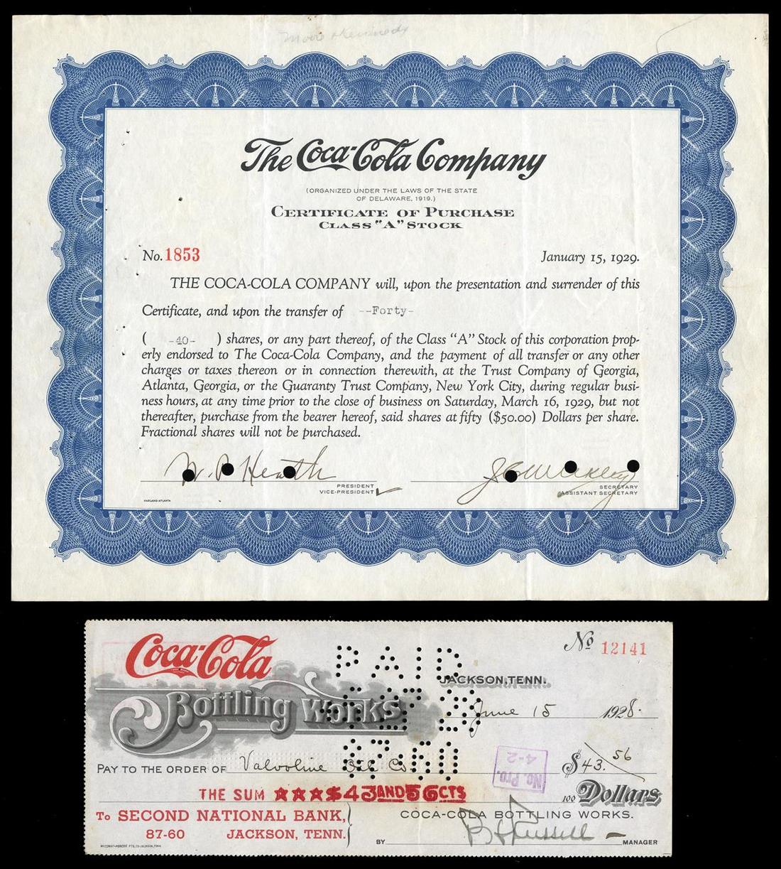 Coca-Cola Company (Delaware) 1929. 40 shares. No.1853. Blue borders. The title printed in the classic italicized lettering style that would become one of the world's most recognizable corporate logos. Class "A" stock. VF. Pinholes, left. Scarce and popular. Also included is a colorful Coca-Cola Bottling Works check from Jackson, Tennessee, 1948.