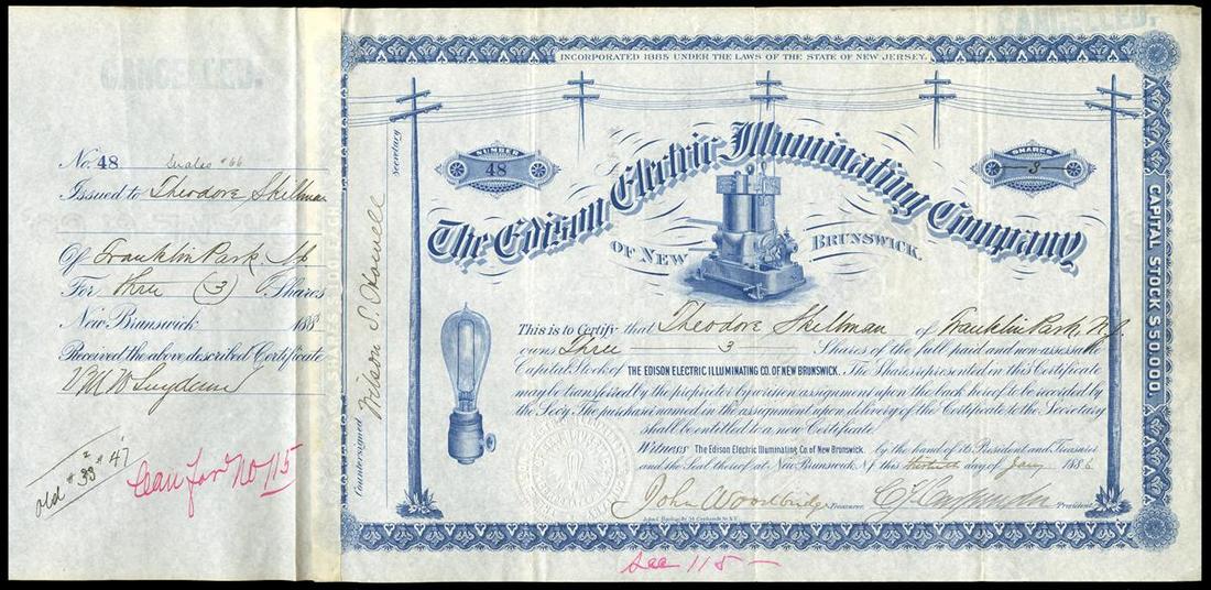Edison Electric Illuminating Company of New Brunswick (New Jersey) 1886. 3 shares. No.48. All blue. An electric generator, telegraph poles and wires and light bulb. . Embossed corporate seal. IU, VF+. The stub is lightly affixed to the left border. Issued, uncancelled, and very nice this issue.