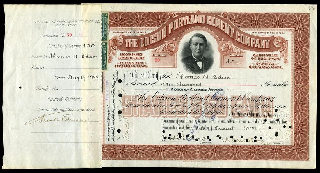 Edison Portland Cement Company (New Jersey) 1899. 100 shares of common capital stock. No.69. Brown border and title. Portrait of Thomas A. Edison. Issued to Edison, and signed by him twice; once on the verso, and on the stub which is affixed to the left end panel. Among Edison's thousands of ideas and inventions was a new process for milling iron ore. This created a great deal of waste material, which Edison put to good use as a raw material for his cement company. ABNCO. IC. VF+. An excellent opportunity to obtain Edison's own shares in one of his companies. Bid accordingly. While the officer's signature's and the corporate seal have several small punch cancels, but both of the Edison signatures are bold, uncancelled, and attractive.