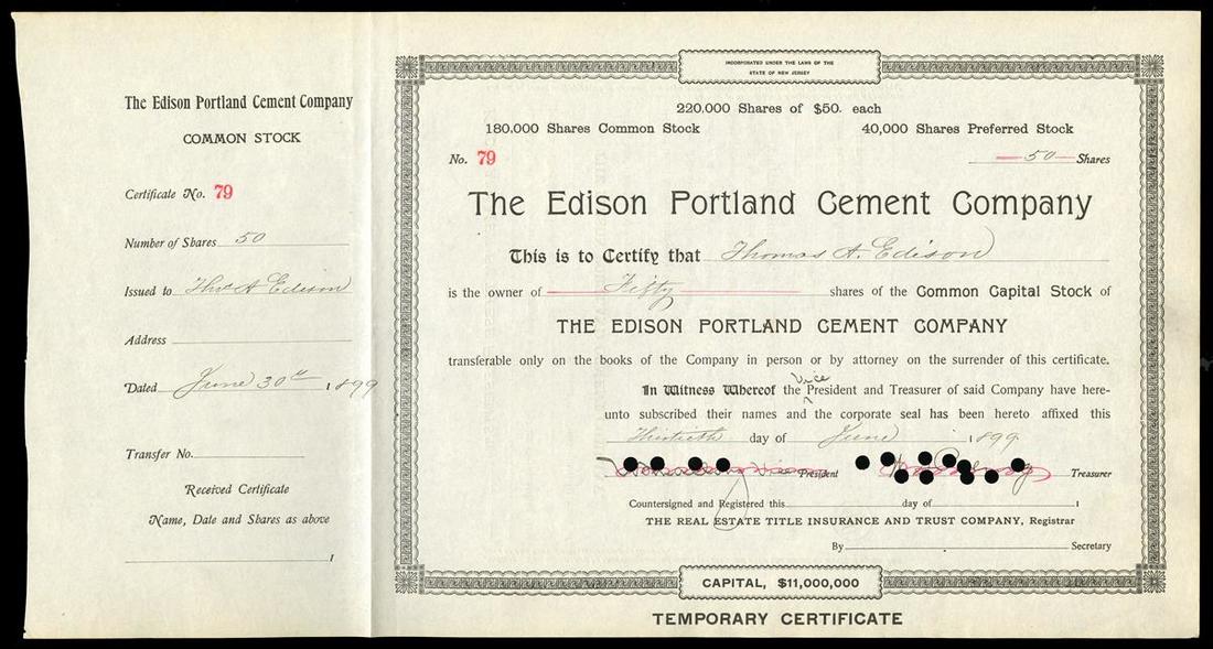 Edison Portland Cement Company (New Jersey) 1899. 50 shares preferred stock. No.79. Temporary certificate issued to Thomas Edison, but not signed by him. EF. Also included are two blank checks on the private account of Thomas A. Edison on the National Newarkand Essex Banking Company, both AU with small edge tears. [3]