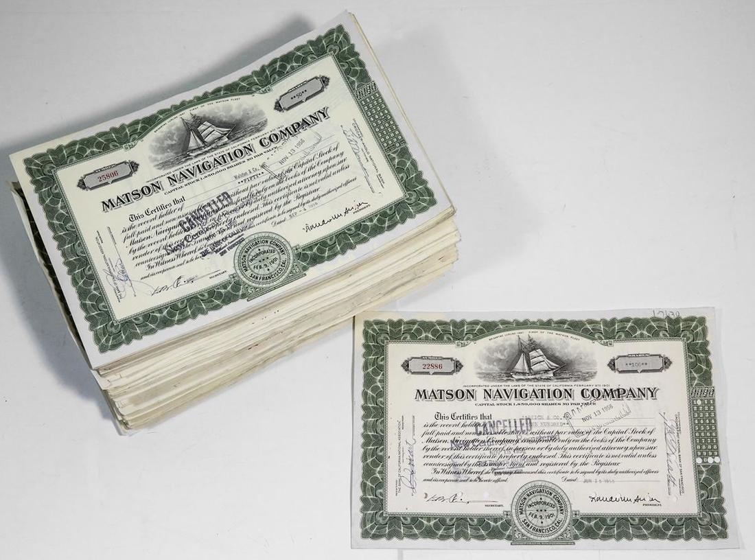 Matson Navigation Company (California) 1950s. Mostly 100 shares or more. Green borders. Brigantine Lurline (1887), the first of the Matson Fleet. Western Bank Note and Engraving Company. Issued, cancelled''. Most are Extremely Fine. A very clean group for the most part. Share certificates with sailing ship vignettes have rarely been offered in any quantity, so bid accordingly. [About 500 examples]