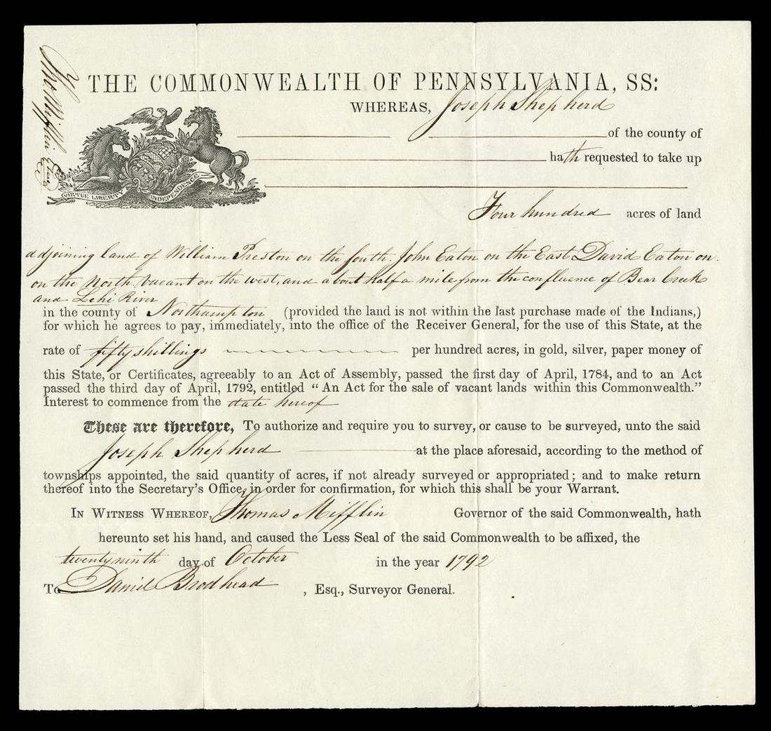 Pennsylvania. Partially Printed Forms Concerning Land Purchases in the 1780s and 1790s. All are typeset, and bear the arms of the state of Pennsylvania at upper left. While they all bear dates in the 1780s and 1790s, they are clearly from a much later period. All are VF or better, though one has some edge splits.