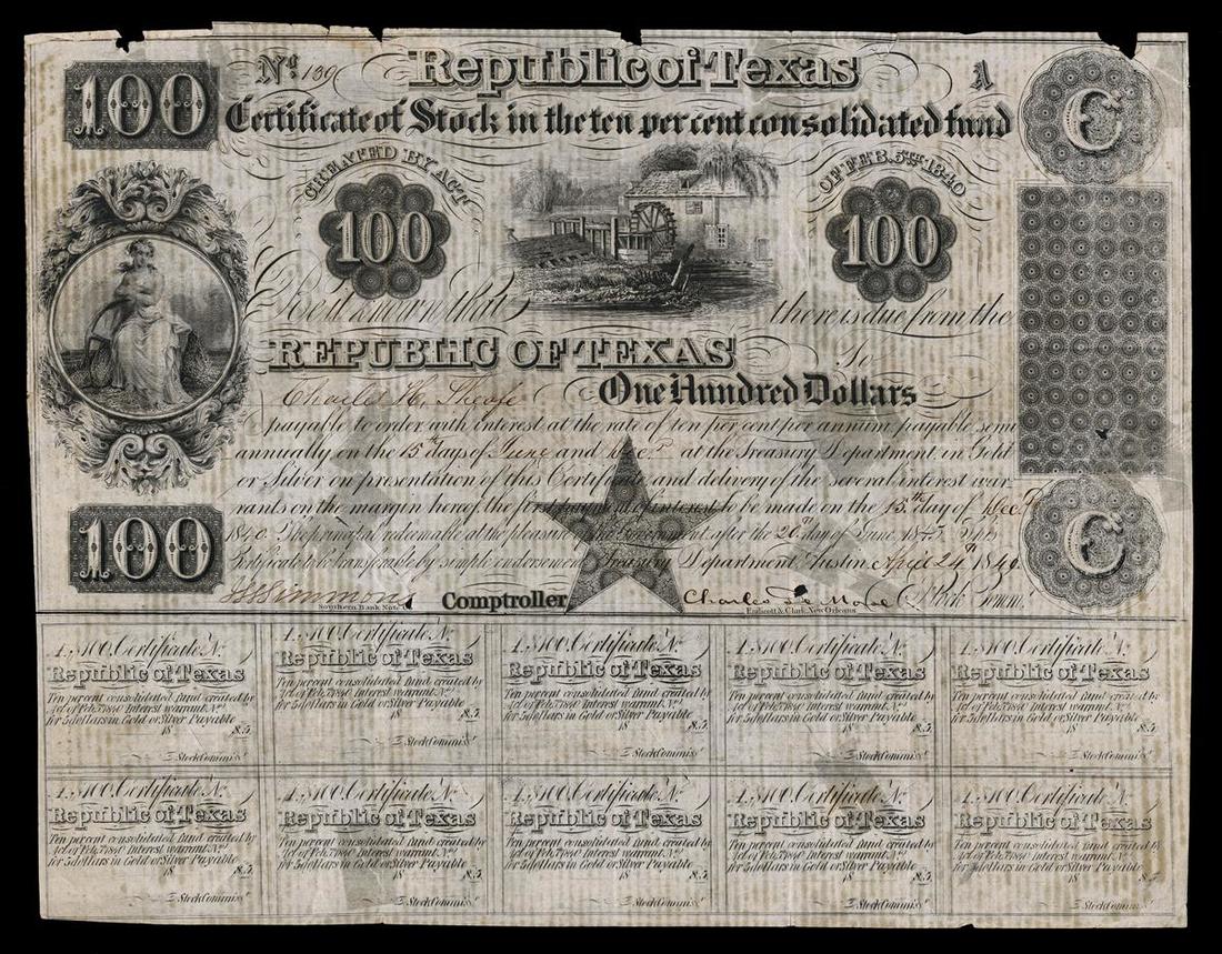 Republic of Texas April 24, 1840. $100. 10% Government bond. No.130. Mill with water wheel. Hope with anchor. Five point star. 6 coupons. Signed by Charles Demorse. Printed by Southern Bank Note Company - Endicott & Clark, New Orleans. VF. Neatly cut cancelled. Minor chips out of the top border and a few very small body holes. Some tape repairs, but overall quite presentable.