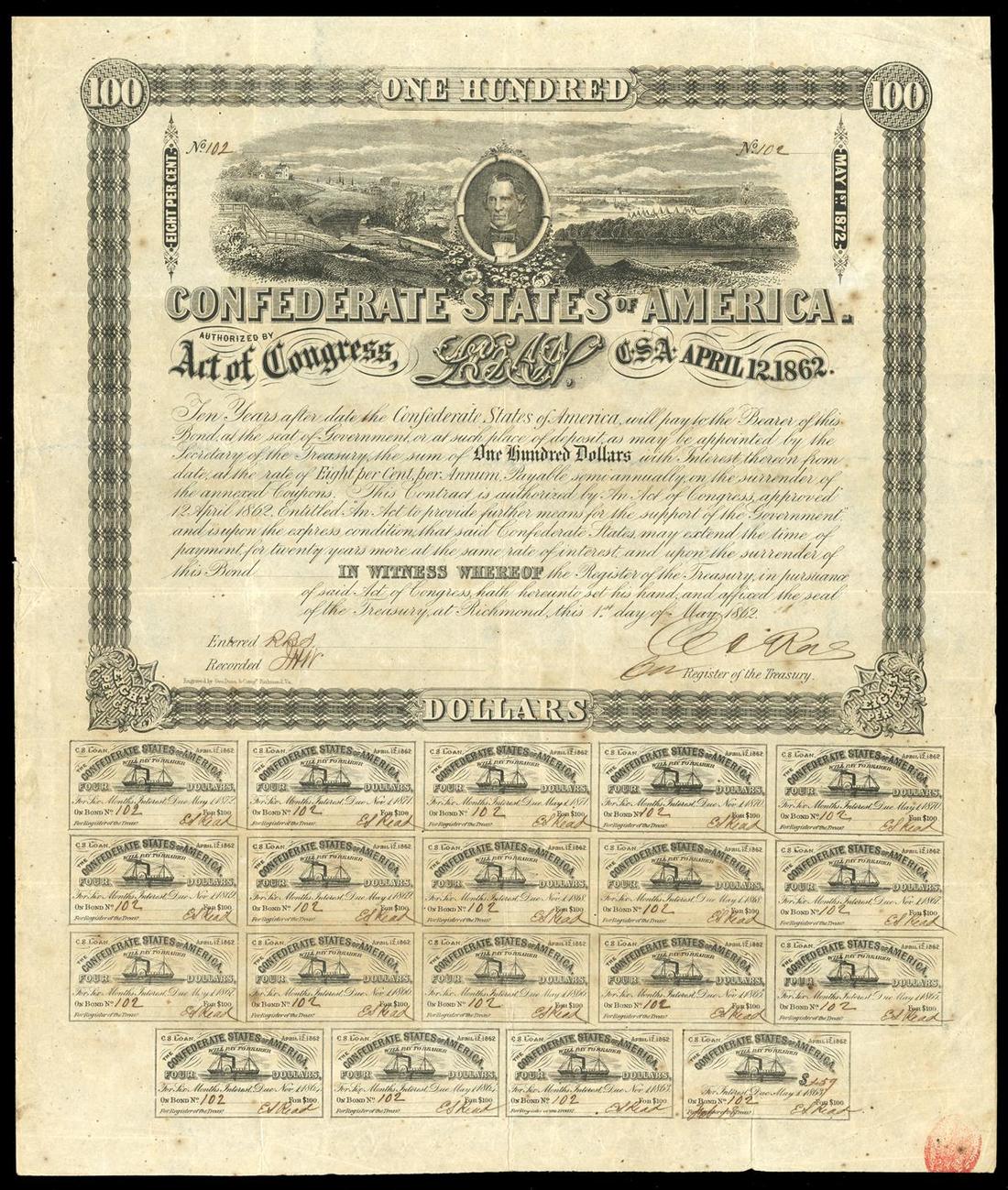 CSA. Act of April 12, 1862. $100 bond. Ball 147. Cr.110. Serial #102. Memminger. Richmond, beyond. VF+. Minor age spots.