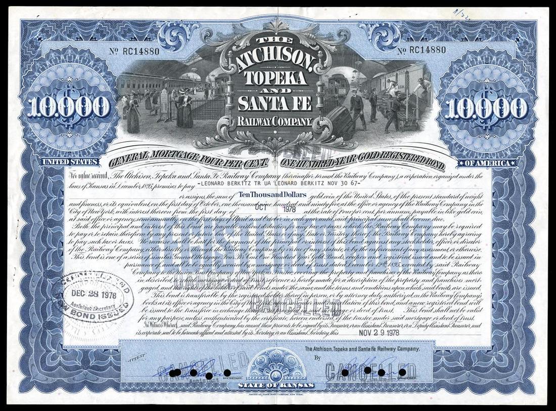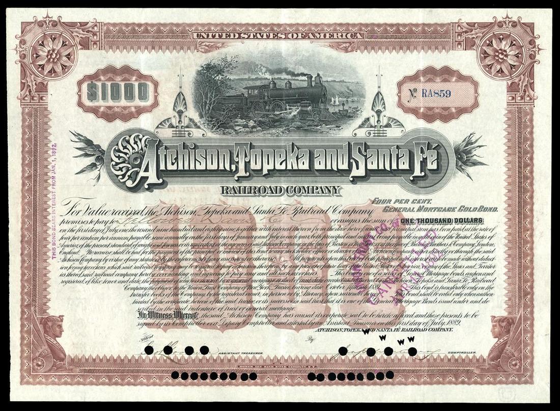 Atcheson, Topeka and Santa Fe Railroad Assortment The selection starts out with a nice assortment of horizontal format bonds from 1889 and 1892 with brown frames and most with the denominations underprinted in a contrasting color: 1889 $1000; $5000; $10,000 4%; $10,000 5%; $50,000; 1892 $1000. Also included are various income gold bond scrips from the 1890s, and various other shares and bonds from the teens, plus a few modern examples. [20+]