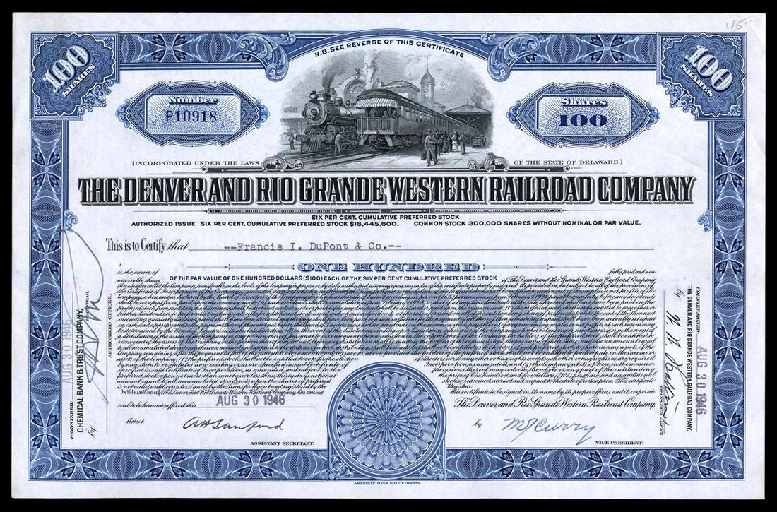 A Fine Selection of Denver and Other Colorado Railroad Bonds and Shares Denver Rio Grande: 1900 10 shs, red, trains in front of mountains; 1917-1920s, tracks through mountain canon(5); Various 1940s(5); Denver Rio Grande Spoorweg-Maatschappij 1903 $1000 Preferred; 1913 Common; Gilpin Tramway 1889 IC, numerous cancels; Southern Colorado Power & Railway $1000 1908 VF+; Colorado & Southern Collateral Trust Note $1000 1904 VF+; Colorado, Wyoming and Eastern Rwy 1914 $1000 6% Gold Bond EF; Denver & Rio Grande Western $1000 1924 IC, VF+; Denver Circle Railroad Company VF+, light stains; St. Louis, Lawrence & Denver Rail Road 1871 $1000 First Mortgage Bond IU, VF+; All examples are issued, most cancelled. Most are VF to VF+. Also included is a Continental Tunnel Railway share certificate, UU, VF+. [21]