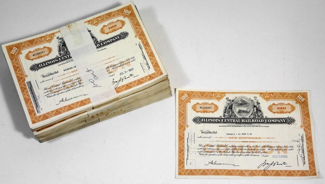 Large Group of Illinois Central Rail Road Share Certificates from the 1950s and 1960s Diesel and steam locomotive in oval frame flanked by semi nude male figures. 200 brown certificates for less than 100 shares, 300 orange certificates for 100 shares. ABNCO. Most are Extremely Fine or better. A nice "retail ready" grouping of rail road shares. [500 total]