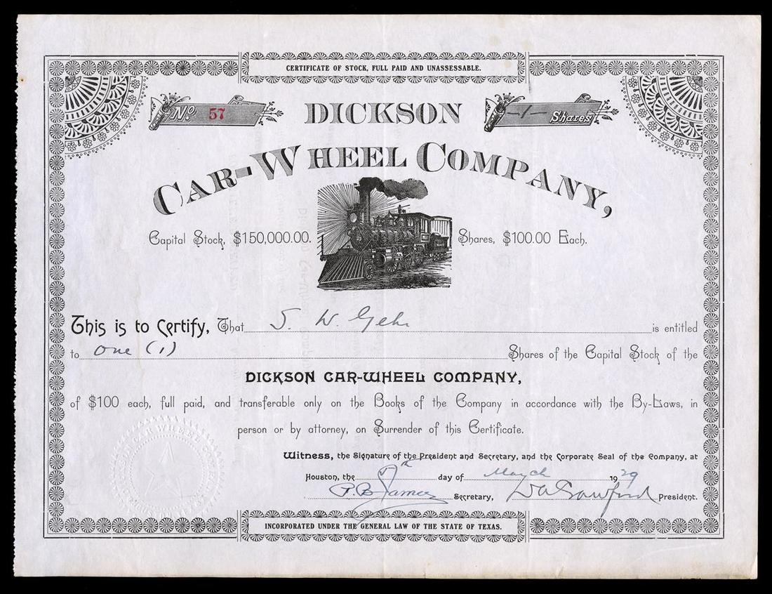 An Assortment of Texas Stocks and Bonds Acme Tap Railroad 1933 One share VF+, heavy cancellation; Chicago, Rock Island & Texas Rwy 1902 Fort Worth, one share IU; Dickson Car-Wheel Company, Houston, 1920s, locomotive with brilliant headlight, three examples IU, VF+; Fort Worth & Denver City Rwy 1906 220 shares IC, VF details but numerous cancellations; Gulf, Colorado & Santa Fe Railway 1924 10 shares IC, VF+; International & Great Northern Railroad 1878 cowboys and cattle VF+; Similar, 1871, with imprinted revenue, cancelled through vignette, and trimmed in at left; Pecos & Northern Texas Railway 1907 one share, VF+; Texas Central Railroad 1896 10 shares VF; Similar 9 shares; Houston & Great Northern Railroad Company of Texas $1000 1872 EF, unissued. [13]