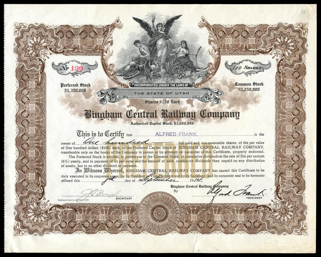 Utah and Utah Related Stocks and Bonds Bingham Central Railway 1914 100 shares brown IU, EF; Mount Hood Railroad 1907 4 shares IC VF+; Salt Lake & Ogden Railway 1911 one share IC, VF, multiple cancelations; Southern Utah Railroad 1909 20 shares IU VF+; National Railway 1926 100 shares IC, VF+; Rapid Transit Company $500 bond IC, VF+, numerous oin cancels; Salt Lake & Utah Railroad 1935 $1000 CD, IU, VF; Similar 1918 $500 & $1000 bond IC, numerous pin cancels. [10]