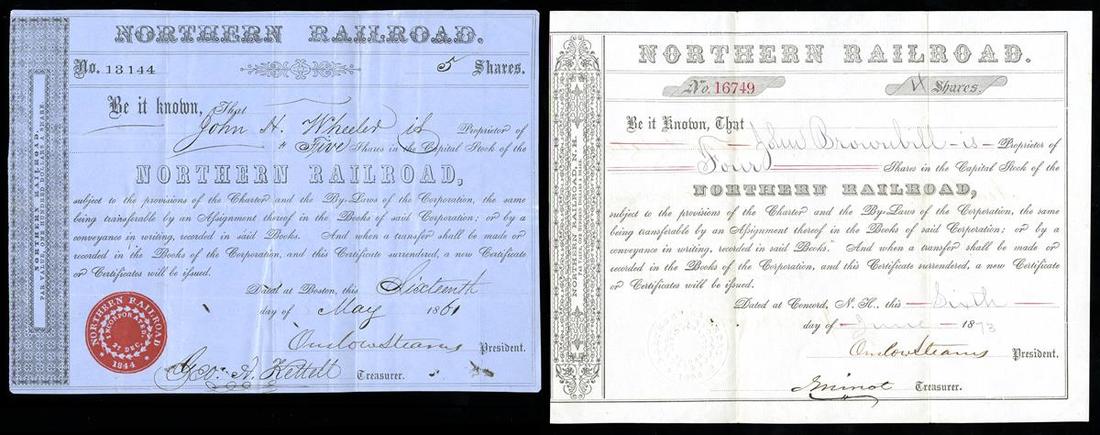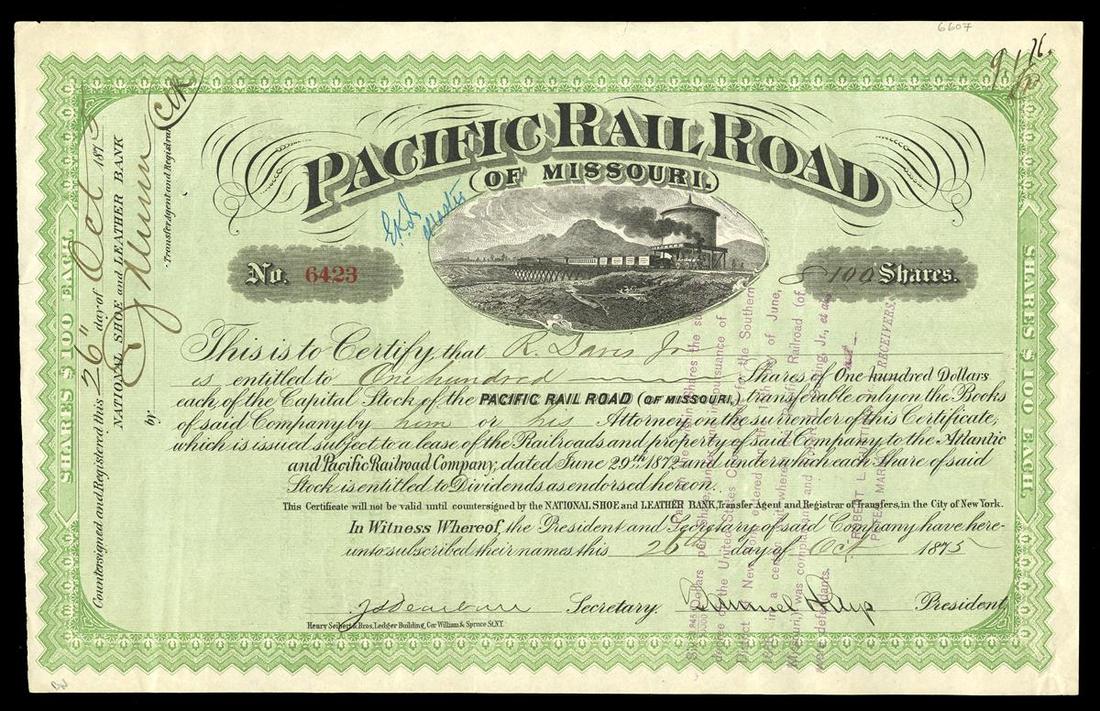 An Array of Mostly North Eastern Railroad Shares from the 1860s and 1870s New Bedford Railroad 1874 110 shares IC, VF+; Haven & Northampton Company 7 shares IC, VF, light stains; New York Central Sleeping Car 161 shares issued to Augustus Schell IC, VF+; Northern Railroad 5 shares on blue paper, IU, VF; Similar 1872 4 shares, IC, VF+; Oil City and Pithole Branch of the Clarion Land and Improvement Company $300 IU, VF+; Old Colony & Fall River Railroad 1862 12 shares, red on blue paper, IU, VF+; Similar, 1864 VF, edge split; Pacific Railroad of Missouri 1873, green 100 shares IC, VF+, endorsement stamped; Pittsburgh, Fort Wayne & chicago Railway 1869 $26 scrip, IC,VF+; Providence, Warren & Bristol Railroad 1860 67 shares, IC, VF, heavy pen cancel; Similar 1870 onw share, IU, VF+; Providence & Worcester Railroad 8 shares 25 Cents yellow imprinted revenue, IC, VF+. [14]