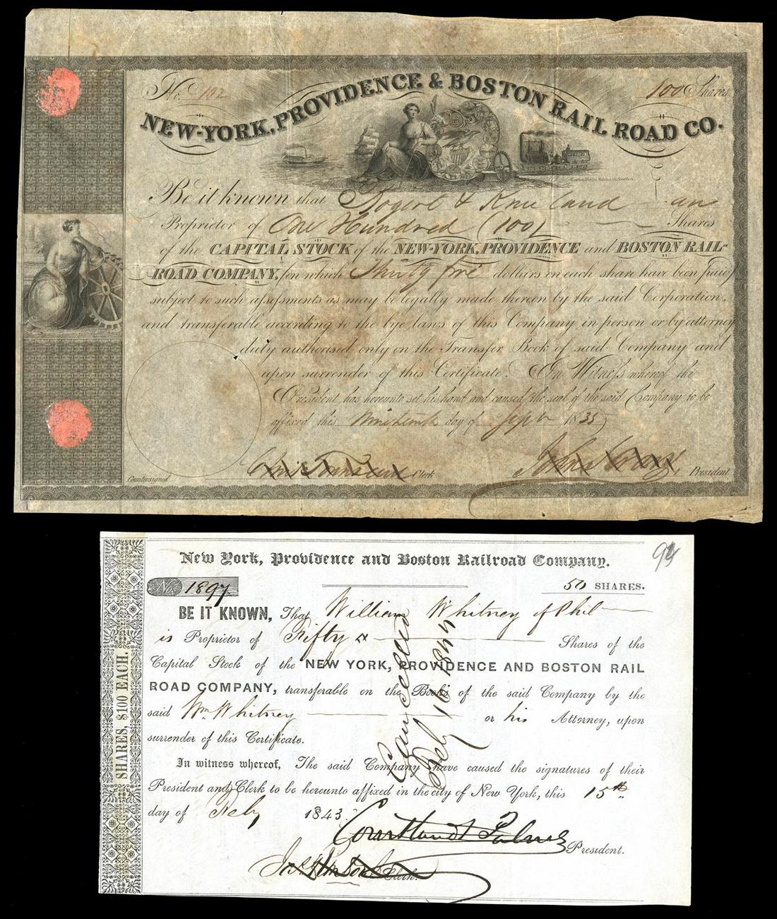 A Selection of Mostly North Eastern Railroad Shares from the 1860s and 1870s New York & Boston Rail-Road 1856 2 shares IC, VF; New York, Providence & Boston Rail-Road:1835 100 shares Capital stock, IC, VF, age toning; Similar, 1843 50 shares IC, EF; Similar 1854 100 shares, red, IC, VF, rough right edge; Northern Indiana Rail-Road 1853 22 shares IC, VF+, two staple holes; Northern Rail Road 1848 one share, blue paper, red seal, IC, VF, small repaired splits; Old Colony Rail Road: 1848 2 shares, blue paper, red seal, IC, VF+; Similar 1850 20 shares, VF+; Similar 1854 61 shares, both IC, VF; Peoria & Bureau Valley RR 1857 100 shares, signed by Judd IC, VF+; Providence, Warren & Bristol RR 1855 3 shares IC, VF, repaired fold splits. [11]
