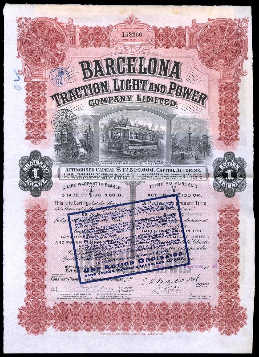 Barcelona, Traction, Light and Power Company, Limited (Canada incorporation) 1913. One share. Vertical bond format with coupons on the right side. Red. Street car near the center flanked by scenes of Barcelona. Waterlow & Sons. VF or Better. Light crayon notations in the left margins. Some with coupon sheets cut off, others with coupon sheets taped to the right margin. Sold as is, no returns. [50 pieces]
