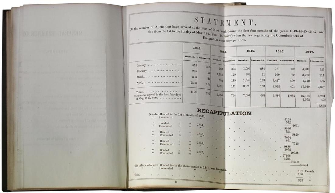 New York City. Annual Report of the Alms House Commissioner...For the Year Ending December 31, 1847. Board of Aldermen. Printed by Wm. B. Townsend, NY 1848. Small Octavo. Gray cloth and board covers, gold stencil Arms on back. Title, 118 pp, pull-out tables. Minor foxing inside covers. A sound copy. Very Good.