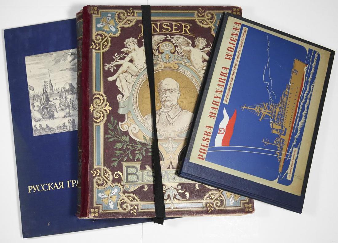 Russian and German Lot: Nasestvie Napoleona Otetsestvennay Vo'ina 1812. St. Petersburg, 1911. Large Folio. Illustrated study of Napoleon's war in Russia and his defeat. Scuffs and water damage to cover. Good; Velikaya Otetsestvennay Vo'ina. 1950. Large Folio. Collection of unbound black and white illustrations. Good; Russkaya Gravyura, 17th-18th veka. 1983. Folio. Some dirt on cover. Good; Russia 20th Century: History of the Country in Poster. 1993. Softbound. Good; Unser Bismarck. By Hans Kraemer, illustrated by Christian Wilhelm Allers. Union Deutsche Verlagsgesellschaft, Stuttgart, etc. ca. 1895. Large folio. Popular work in 1890's Germany. Good; das deutsche Volk in Waffen, Der Weltkrieg, 1914-1918. Heinrich Schröder. Berlin. Folio. Illustrated German work, just post war on the Great War. Cover slightly warped. Good; also Polska Marynarka Wojenna. Album Pamiatkowy 1947. Illustrated work on the Polish Navy. Very Good. [7]