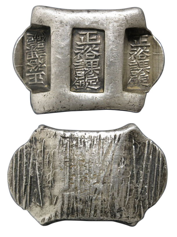 Yunnan Province, "Zheng Yu Ke Ding" 5.5 Taels "Publicly Agreed Fine Silver" tax ingot, weigh 202g , called as well "Pai Fang Ding" or "pack saddle" or "saddlepack" sycee due to its form. Three identical stamps "Zheng Yu Ke Ding " (Zheng Yu Bank), no assayer's chop or date.