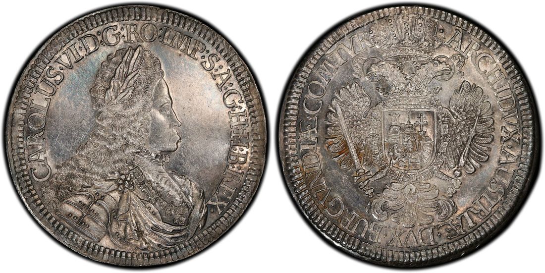 This large silver double Taler is the second finest known in the PCGS Census. Definitively a grand example of how Austrian engravers mastered their art and technics to feature so much entricated fine details on a coin. Very well preserved surfaces showcasing a strong and even strike. This classic rarity is further enhanced by a beautiful grayish original mint patina.