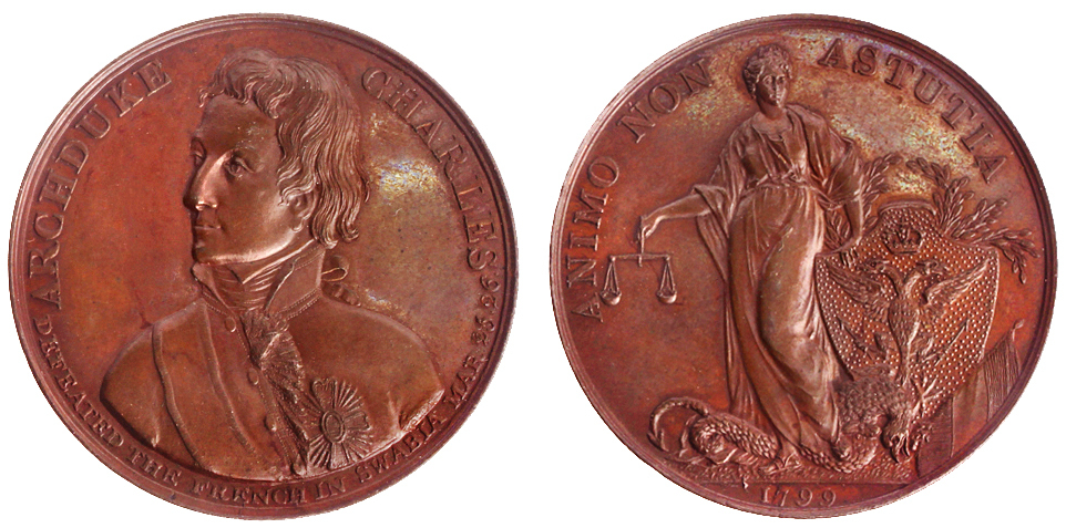 1799 Bronze Medal by Wion to commemorate the siege of Erzherzog Karls against the Frenchs in Schwaben and the alliance with Russia.