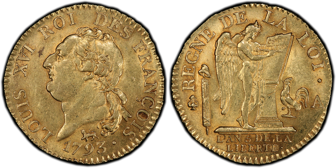 Following a decree on February 5th 1793, the King's portrait disappeared from the observe and the striking of the 24 livres series was further abolished.
