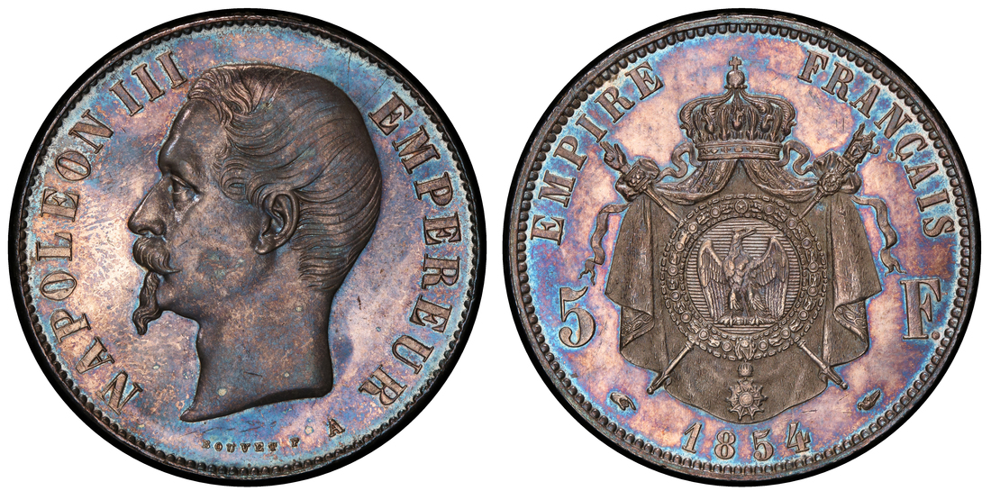 Very low mintage: only 10,599.struck, making this coin a scarce piece among the Napoleon III Silver 5 Francs coinage series, especially in MS grades (the combined mintage for all years :14,145,228 struck for this type).
