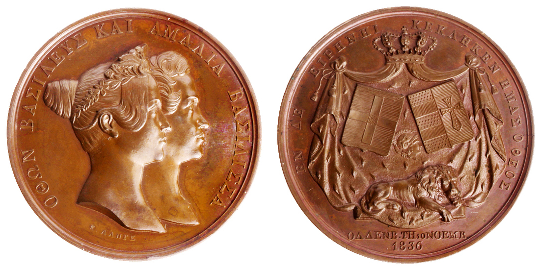 1836 Copper Wedding Medal with Amalia, Duchess of Oldenburg by K. Lange. Diameter 44mm, ref. Witt 2863. Obv. double coinjoined busts right, rev. lion below arms on crowned mantle.