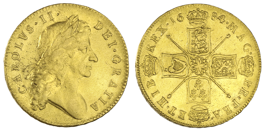 Five-Guineas, 1684, gold, obv. second laureate bust right, rounded truncated, legend CAROLVS II DEI GRATIA. Toothed border both sides, rev. inverted die axis, four crowned cruciform shields, four scepters in angles with four interlinked C's in center, date at top, legend MAG BR FRA ET HIB REX, 1684. Raised letter edge inscription DECVS ET TVTAMEN ANNO REGNI TRICESIMO SEXTO. Ref. Schneider 427; MCE.29; S.3331. Variety without elephant.