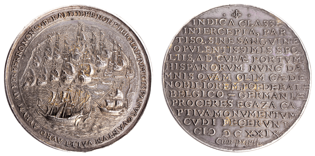 Silver Medal for the Capture of the Spanish Silver Fleet at Matanzas Bay, in Cuba, unsigned. weight 58.41g, diameter 58.87mm. Obv. naval scenery depicting in the background ships and smaller boats at right into the Matanzas bay, and at the forefront Heyn's flagship , at back an unbroken shoreline beyond without mountains, circular legend NON FERRO TANTVM HISPANVS QVANTVM VALET AVRO: AVRVM AVFER FERRO NON SVPEREBIT IBER:, rev. legend in 14 lines, INDICA CLASSE INTERCEPTA, PARTISQ. SINE SANGVINE OPVLENTISSIMIS SPOLIIS AD CVBÆ PORTVM, HISPANORVM NVNC DAMNIS QVAM OLIM CAEDE, NOBILIOREM, FOEDERATAE BELGICO-GERMANIÆ PROCERES E GAZA CAPTIVA MONVMENTVM CVDI FECERVNT. CIC DCXXIX. Cum Privil.